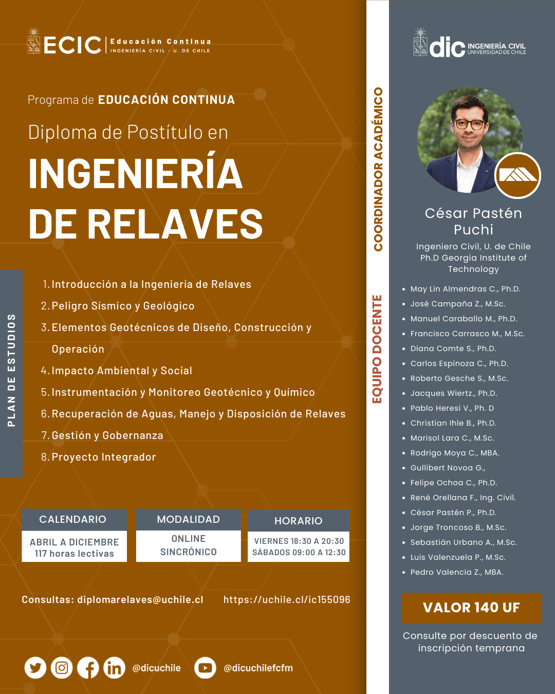 Proyectos de investigación: Proyecto: INGENIERÍA ESTRUCTURAL Y DISEÑO SÍSMICO Autor: FABIAN ROJAS BARRALES Proyecto: INGENIERÍA EDE RELAVES Autor: CÉSAR PASTÉN PUCCI